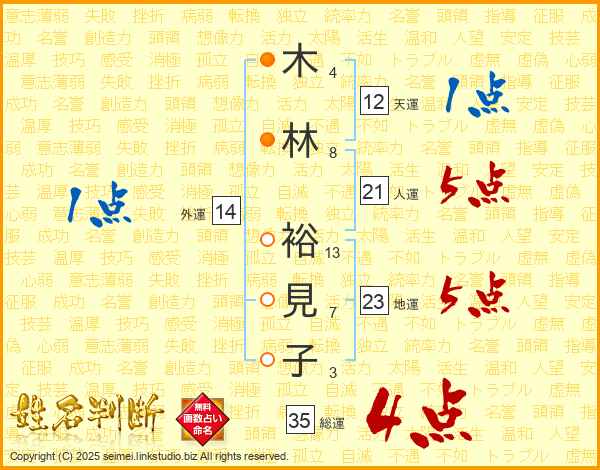 木(4画)林(8画) 裕(13画)見(7画)子(3画)