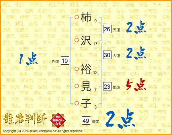 柿(9画)沢(17画) 裕(13画)見(7画)子(3画)