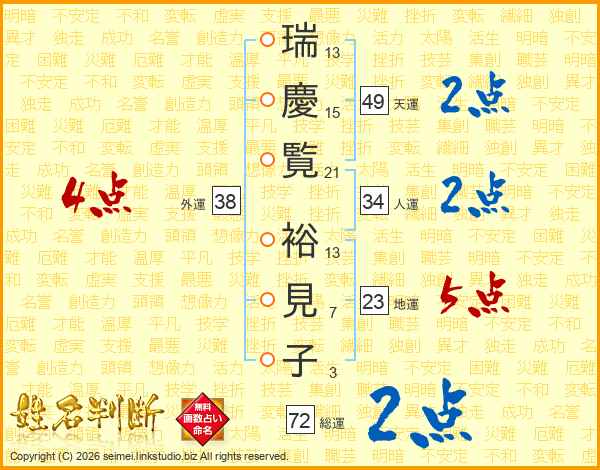 瑞(13画)慶(15画)覧(21画) 裕(13画)見(7画)子(3画)