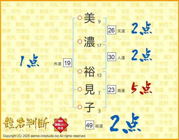 美(9画)濃(17画) 裕(13画)見(7画)子(3画)