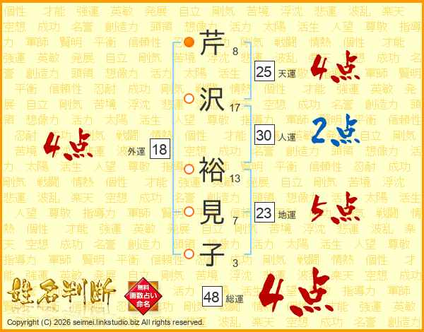 芹(8画)沢(17画) 裕(13画)見(7画)子(3画)