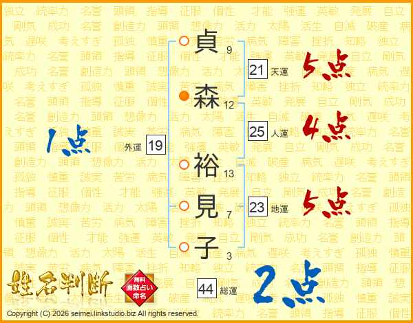 貞(9画)森(12画) 裕(13画)見(7画)子(3画)