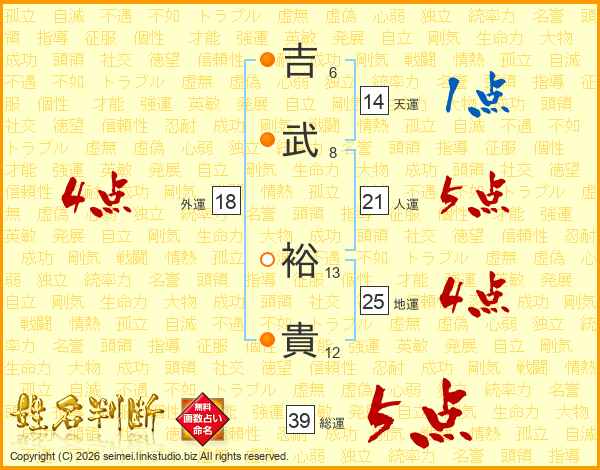 吉(6画)武(8画) 裕(13画)貴(12画)