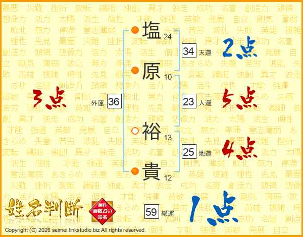 塩(24画)原(10画) 裕(13画)貴(12画)