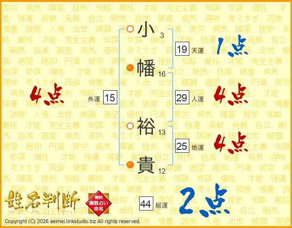 小(3画)幡(16画) 裕(13画)貴(12画)