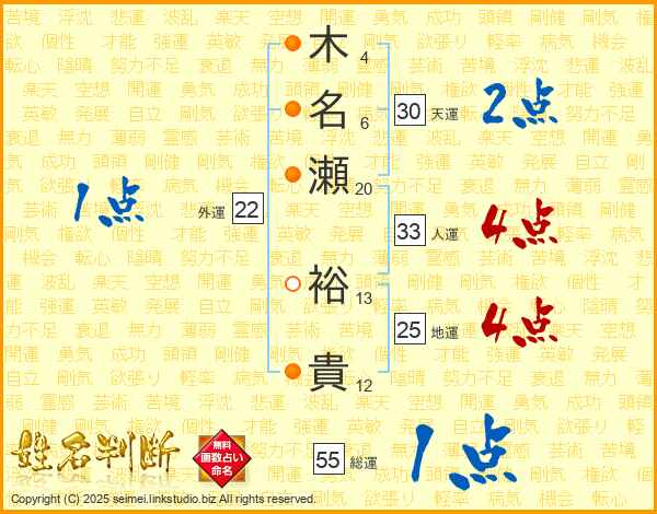 木名瀬裕貴さんの地運は25画の4点!