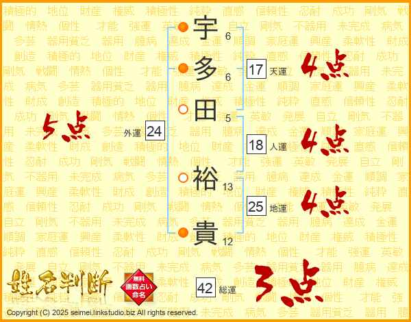 宇(6画)多(6画)田(5画) 裕(13画)貴(12画)