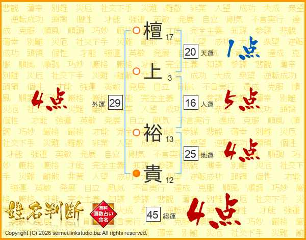 檀(17画)上(3画) 裕(13画)貴(12画)