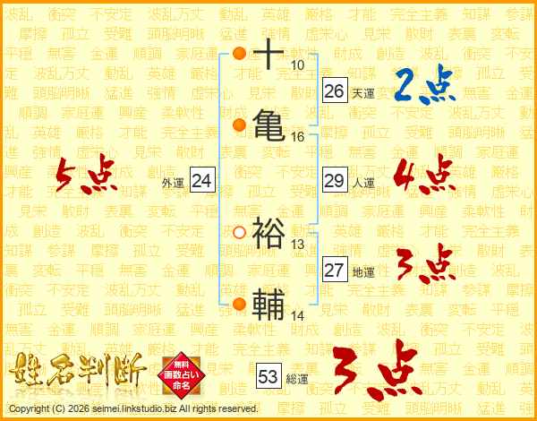 十(10画)亀(16画) 裕(13画)輔(14画)