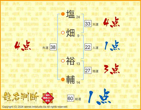 塩(24画)畑(9画) 裕(13画)輔(14画)