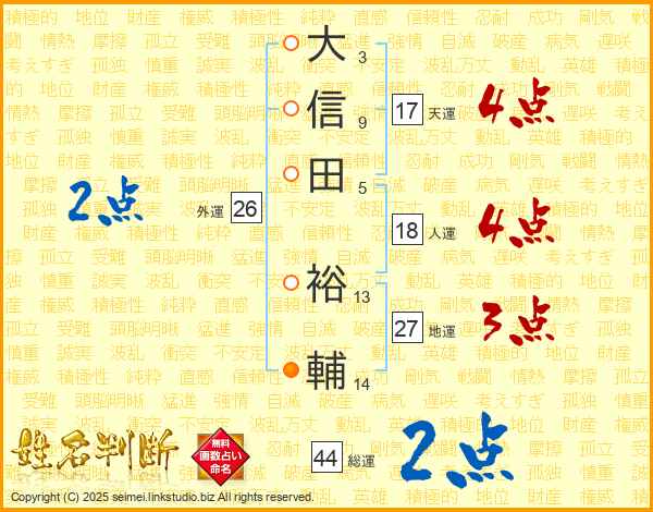 大(3画)信(9画)田(5画) 裕(13画)輔(14画)