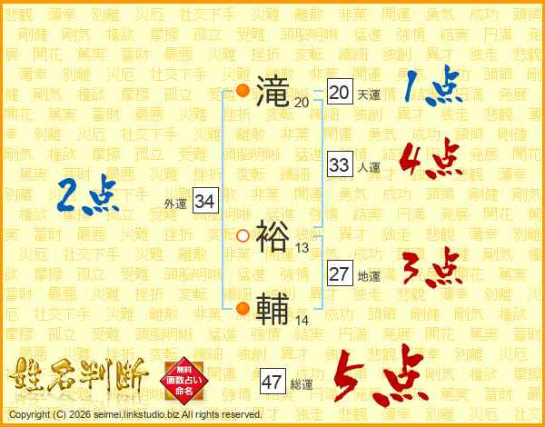 あなたの人生を表す1番重要な運勢です。生涯を通じて影響する総合運となり、主に50歳以降の晩年期に影響を及ぼします。苗字と名前の合計画数。