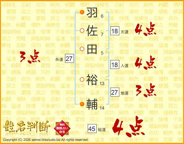 羽(6画)佐(7画)田(5画) 裕(13画)輔(14画)