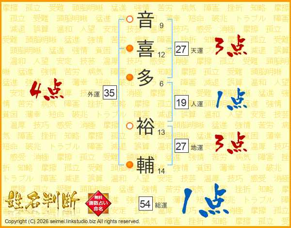 音(9画)喜(12画)多(6画) 裕(13画)輔(14画)