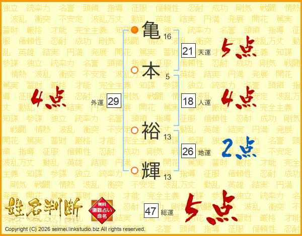 亀(16画)本(5画) 裕(13画)輝(13画)