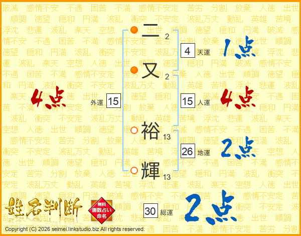 生活面を象徴する運勢です。外部から受ける影響力を表し、結婚運、家庭運や職場、環境への順応性を表します。総運から人運を引いた画数。姓や名が1文字の場合を除く。