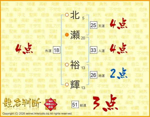 北(5画)瀬(20画) 裕(13画)輝(13画)