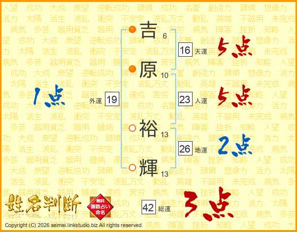 吉(6画)原(10画) 裕(13画)輝(13画)