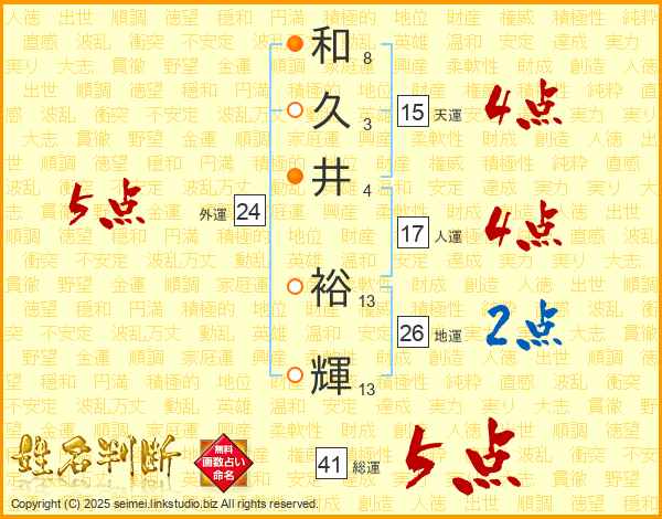 和(8画)久(3画)井(4画) 裕(13画)輝(13画)