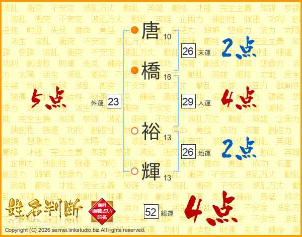 唐(10画)橋(16画) 裕(13画)輝(13画)
