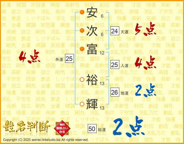 安(6画)次(6画)富(12画) 裕(13画)輝(13画)