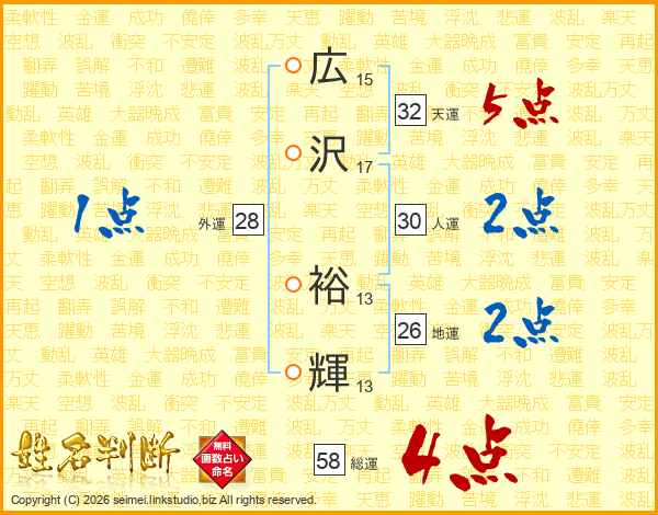 広(15画)沢(17画) 裕(13画)輝(13画)