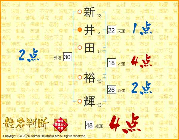 新(13画)井(4画)田(5画) 裕(13画)輝(13画)