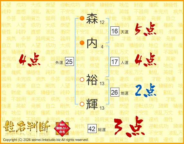 森(12画)内(4画) 裕(13画)輝(13画)
