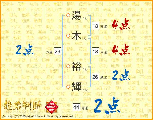 湯(13画)本(5画) 裕(13画)輝(13画)