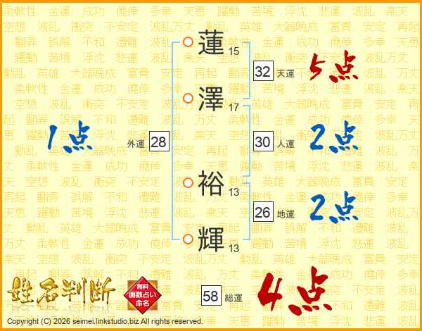 蓮(15画)澤(17画) 裕(13画)輝(13画)