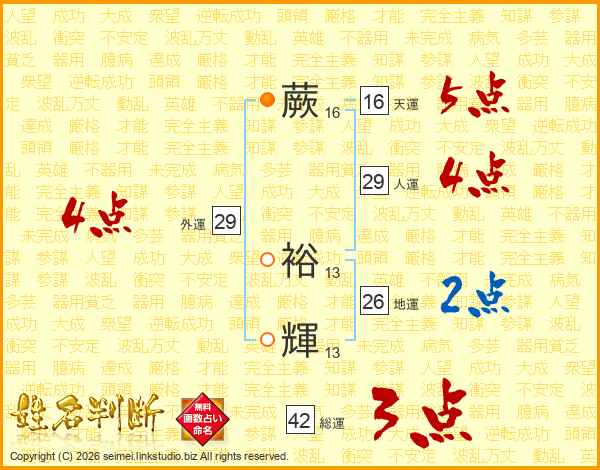 蕨裕輝さんの天運は16画の5点!