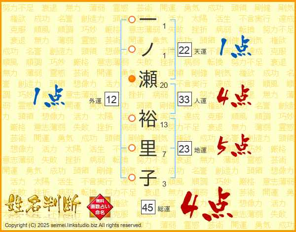 一ノ瀬裕里子さんの総運は45画の4点!