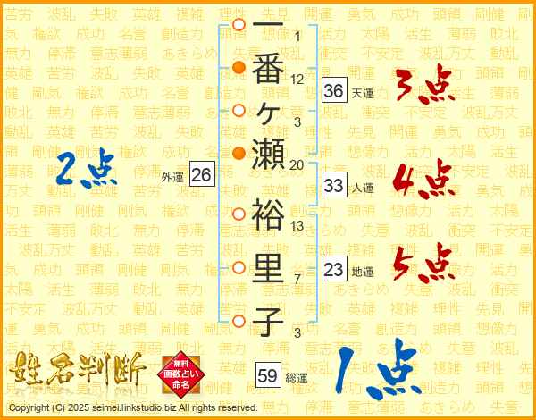 一番ヶ瀬裕里子さんの総運は59画の1点!