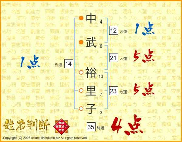 中(4画)武(8画) 裕(13画)里(7画)子(3画)