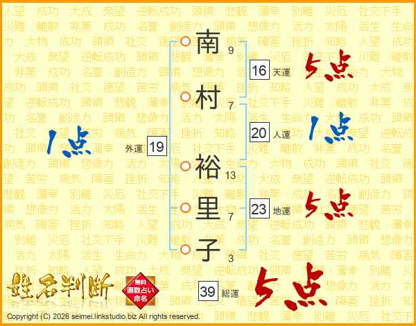 南(9画)村(7画) 裕(13画)里(7画)子(3画)