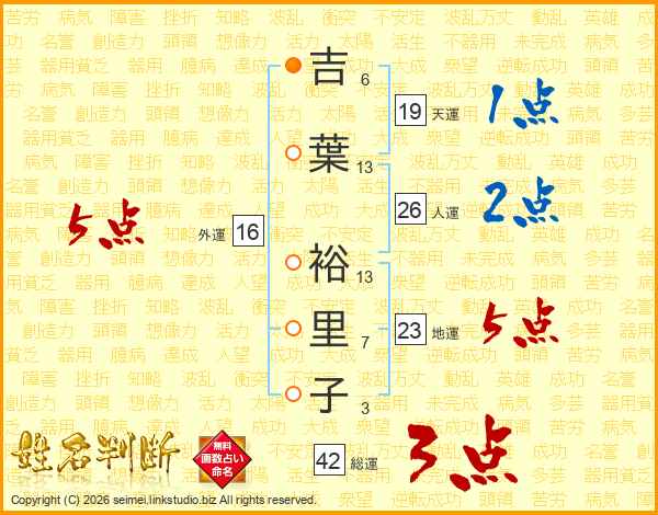 吉(6画)葉(13画) 裕(13画)里(7画)子(3画)
