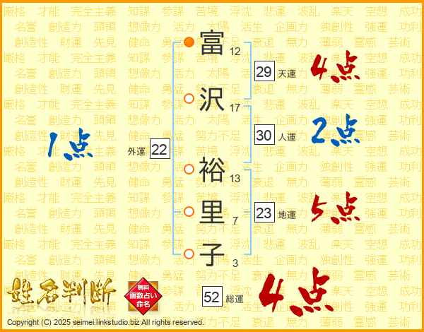 富(12画)沢(17画) 裕(13画)里(7画)子(3画)
