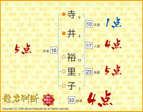 寺(6画)井(4画) 裕(13画)里(7画)子(3画)