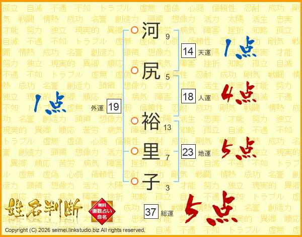 河(9画)尻(5画) 裕(13画)里(7画)子(3画)