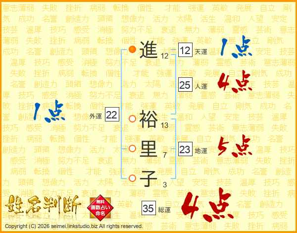 生活面を象徴する運勢です。外部から受ける影響力を表し、結婚運、家庭運や職場、環境への順応性を表します。総運から人運を引いた画数。姓や名が1文字の場合を除く。