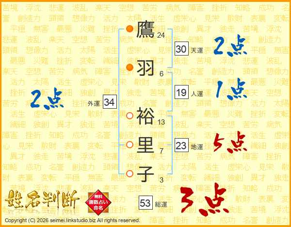 鷹(24画)羽(6画) 裕(13画)里(7画)子(3画)