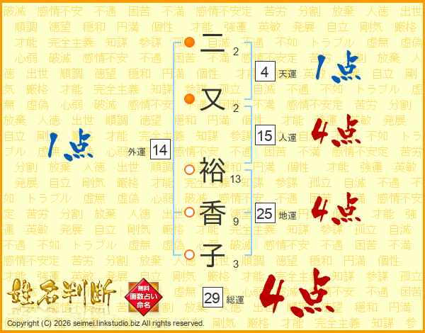 二(2画)又(2画) 裕(13画)香(9画)子(3画)