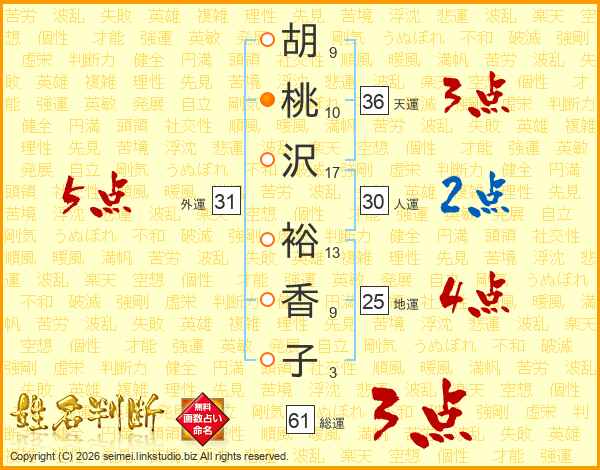 胡(9画)桃(10画)沢(17画) 裕(13画)香(9画)子(3画)