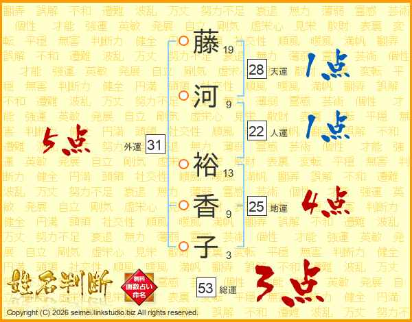 藤(19画)河(9画) 裕(13画)香(9画)子(3画)