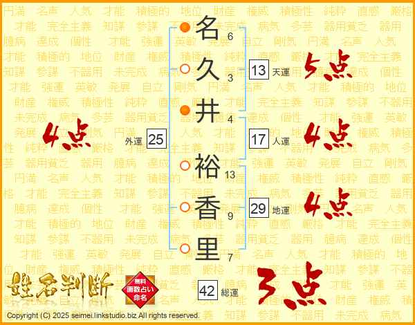 名(6画)久(3画)井(4画) 裕(13画)香(9画)里(7画)