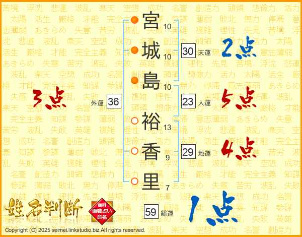宮(10画)城(10画)島(10画) 裕(13画)香(9画)里(7画)