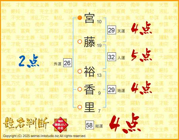 宮(10画)藤(19画) 裕(13画)香(9画)里(7画)