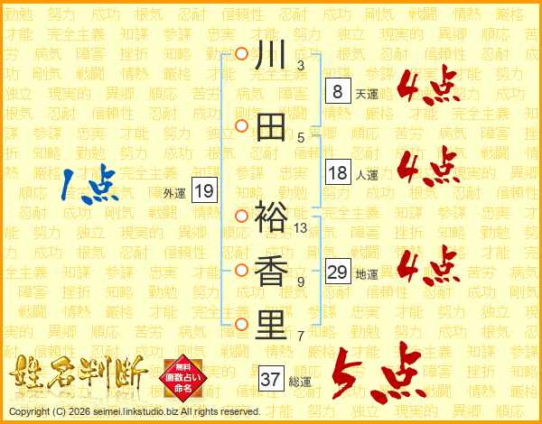 川(3画)田(5画) 裕(13画)香(9画)里(7画)