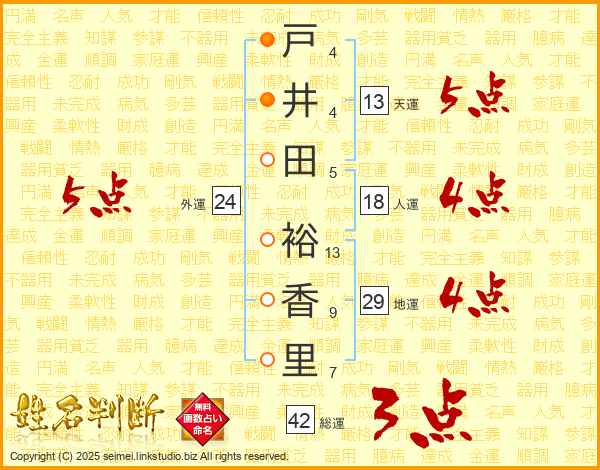 戸(4画)井(4画)田(5画) 裕(13画)香(9画)里(7画)