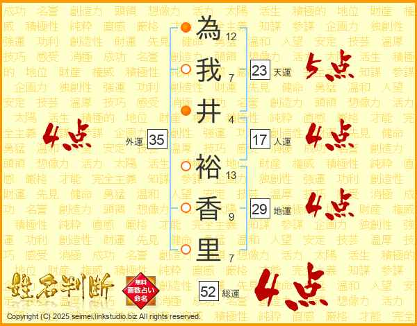 為(12画)我(7画)井(4画) 裕(13画)香(9画)里(7画)